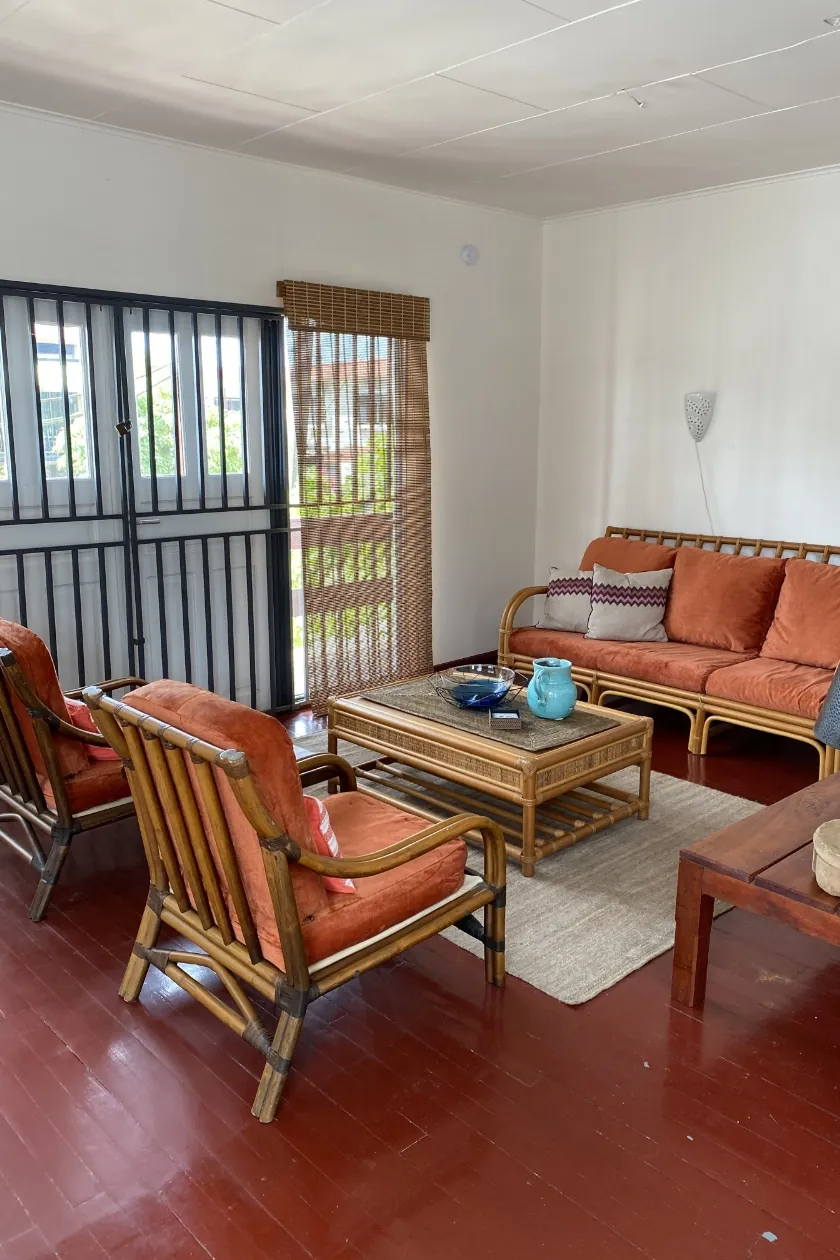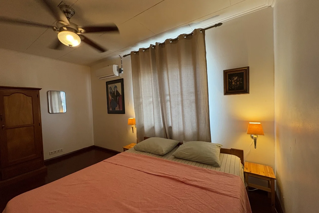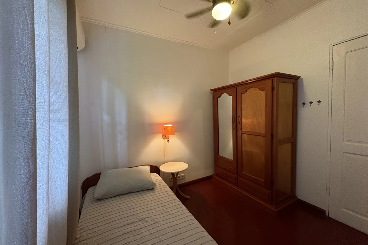 The apartment is fully furnished and equipped with all modern conveniences. The open-plan kitchen connects directly to the living room, creating a large, cozy space. It features a large and a smaller bedroom, both equipped with air conditioning and ceiling fans. The bathroom and toilet are located near the entrance.