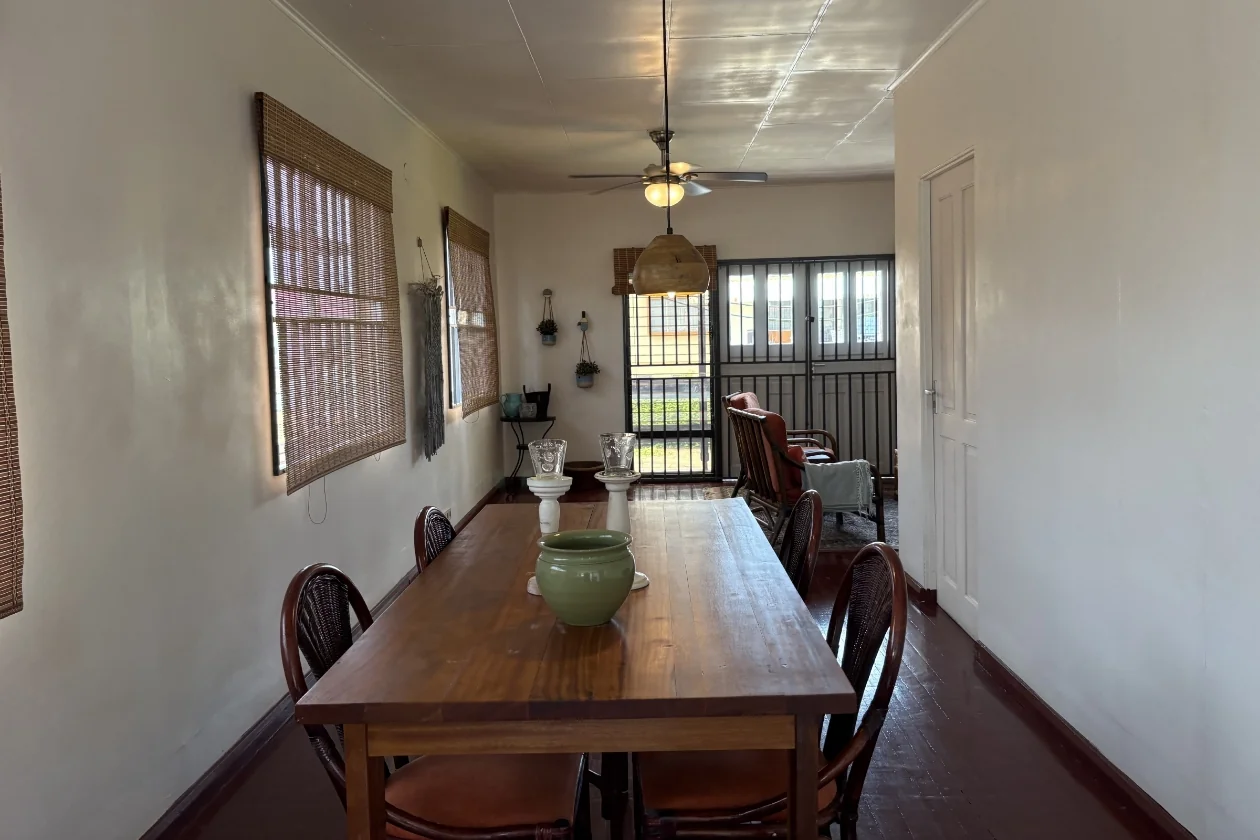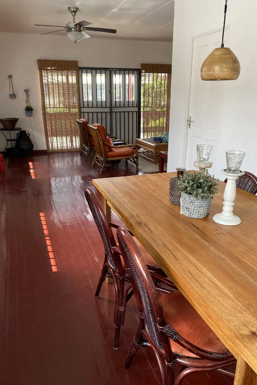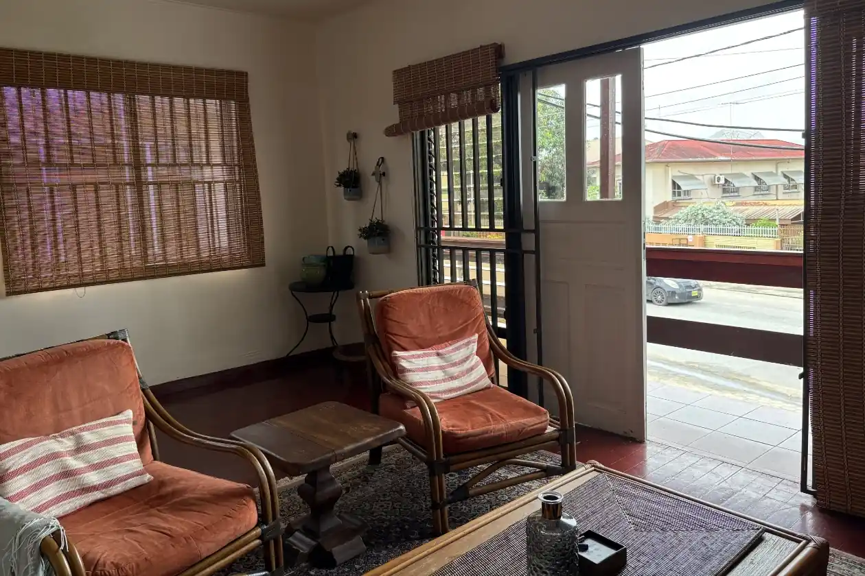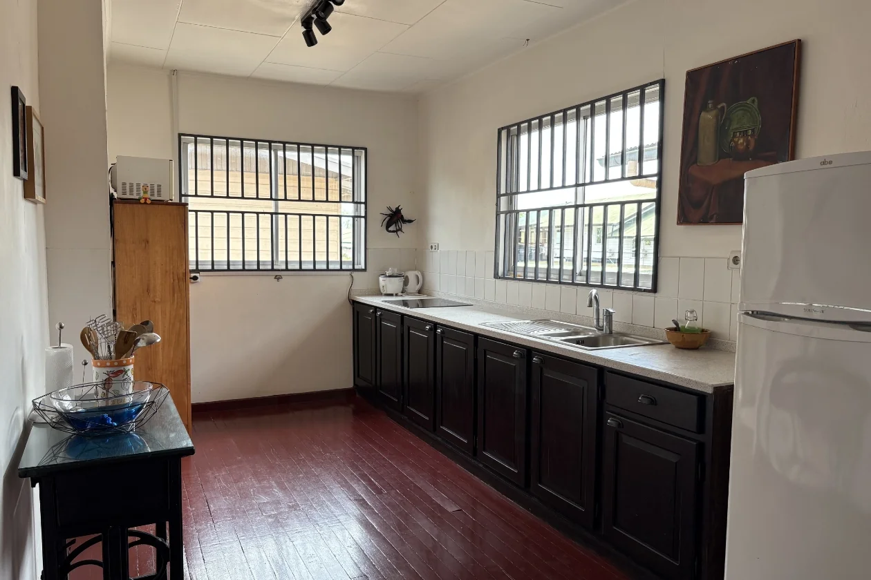The apartment is fully furnished and equipped with all modern conveniences. The open-plan kitchen connects directly to the living room, creating a large, cozy space. It features a large and a smaller bedroom, both equipped with air conditioning and ceiling fans. The bathroom and toilet are located near the entrance.